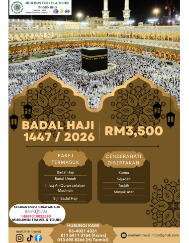 Muslimin Travel menawarkan perkhidmatan Badal Haji bagi mereka yang tiada harapan untuk sembuh atau telah meninggal sebelum sempat menunaikan haji. Tunaikan tanggungjawab mereka kepada Allah SWT melalui wakil Upah Haji. InsyaAllah, kami akan melaksanakannya dengan penuh amanah dan komited. | Skim Bayaran Mudah dari RM158/bulan x 24 bulan